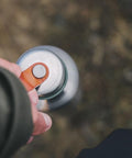 ヴィーガンレザーのベルトが蓋と繋がっているので、蓋を落とす心配がありません。 持ち手にもなり、手が小さな方でも持ち運びやすいつくりです。