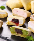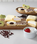 生地は和菓子屋ならではの大福のようなもちっとした食感を再現しております。その風味豊かなクレープ生地に、甘さ控えめのホイップクリームを包みました。7種類のクレープとバラエティ感のあるセット。